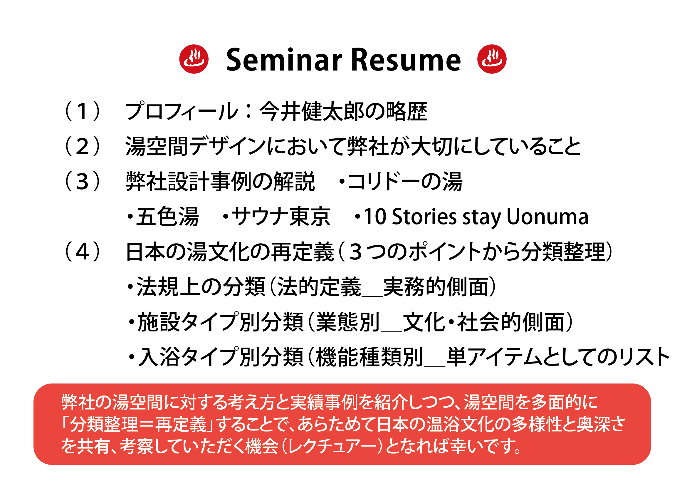 今井健太郎が「大手組織設計M社 月例の外部講師によるレクチュアープログラム」の講師を務めさせていただきました。M社さんでは、さまざまなジャンルの方に講師を依頼されているそうで、過去の登壇社を見ると多くの著名人が名を連ねていました。今井健太郎は温浴施設の専門デザイナーということでお招きいただきました、これは言ってみれば、同業である設計デザインのプロの方々を前にお話しするということで、光栄な機会をいただきまして、ありがとうございました。講演は「湯空間〜弊社の設計実例と現代KOTIRの再定義」と題し、実績紹介を通じて銭湯・サウナ・温泉について弊社の考え方をお話しさせていただきました。サウナに関心の高いスタッフさんも多く、質疑応答では楽しくマニアックな質問もいただきました。ありがとうございました。